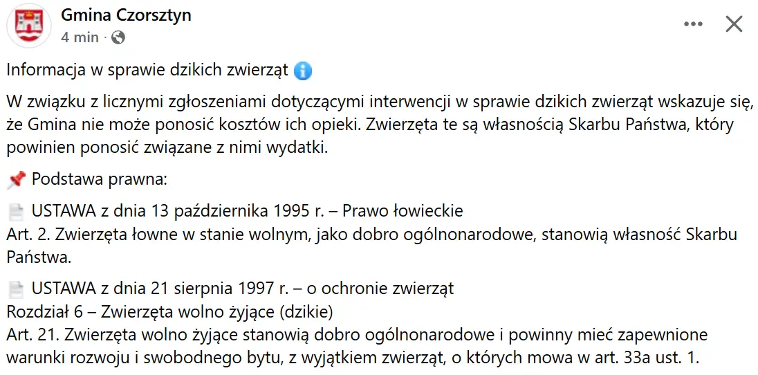 W treści informacji urząd podkreśla, że nie może ponosić kosztów opieki nad dzikimi zwierzętami, ponieważ są one własnością Skarbu Państwa. Jako podstawę wskazano Prawo łowieckie oraz ustawę o ochronie zwierząt. Problem w tym, że dla mieszkańców nie jest to odpowiedź na realne sytuacje, z którymi mierzą się na co dzień.