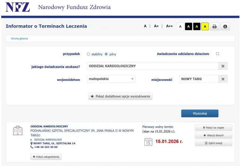 Ważnym pytaniem dla pacjentów pozostają terminy leczenia. Sprawdziliśmy je w Informatorze o Terminach Leczenia prowadzonym w zasobach Narodowego Funduszu Zdrowia. Wynika z niego, że w przypadku skierowań pilnych przyjęcia na oddział kardiologiczny realizowane są praktycznie bez zwłoki, nawet z terminem na "wczoraj".