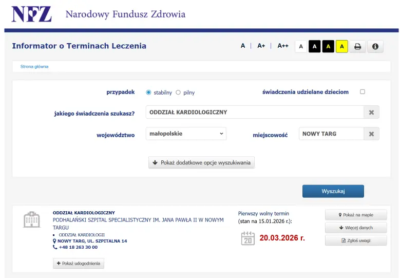Każdy zainteresowany może samodzielnie sprawdzić aktualne terminy w publicznym informatorze NFZ dotyczącym terminów leczenia pod adresem https://terminyleczenia.nfz.gov.pl/